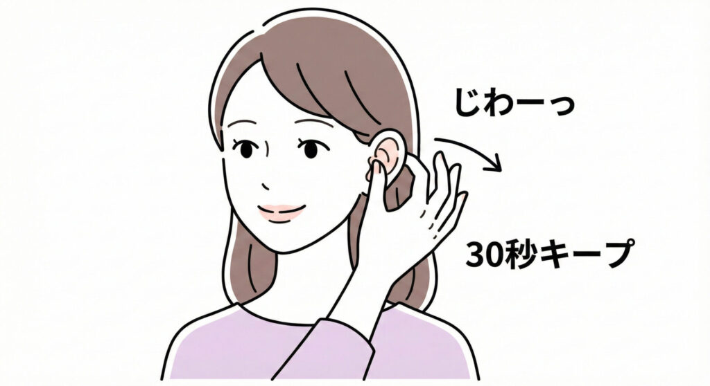 - 耳を横(外側)に向かって、「じわーっ」とゆっくり引っ張ります。