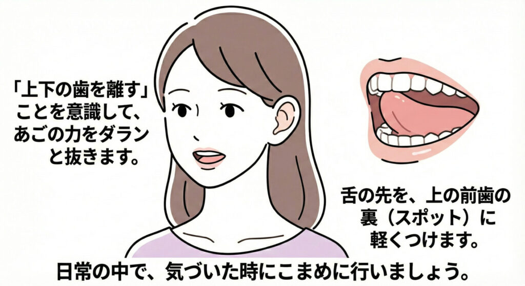 - 「上下の歯を離す」ことを意識して、あごの力をダランと抜きます。