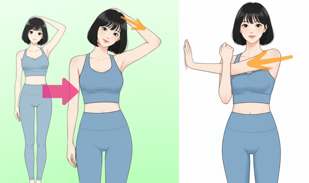 ②壁に手をついて肩関節のストレッチも無理のない範囲でしてください。